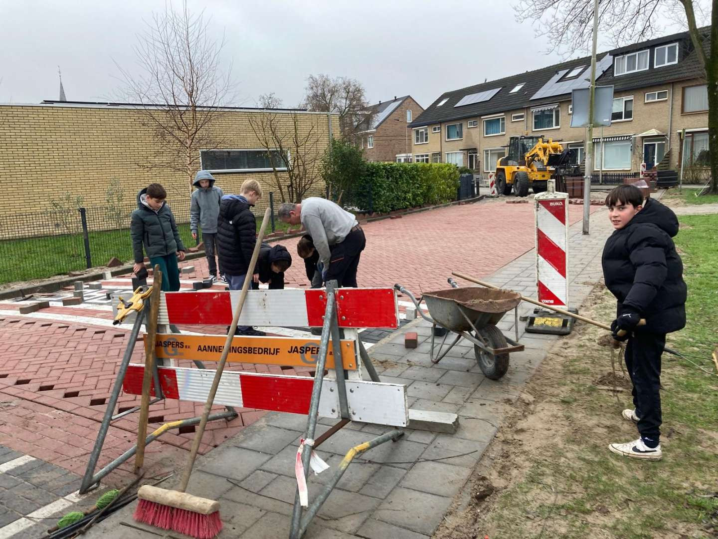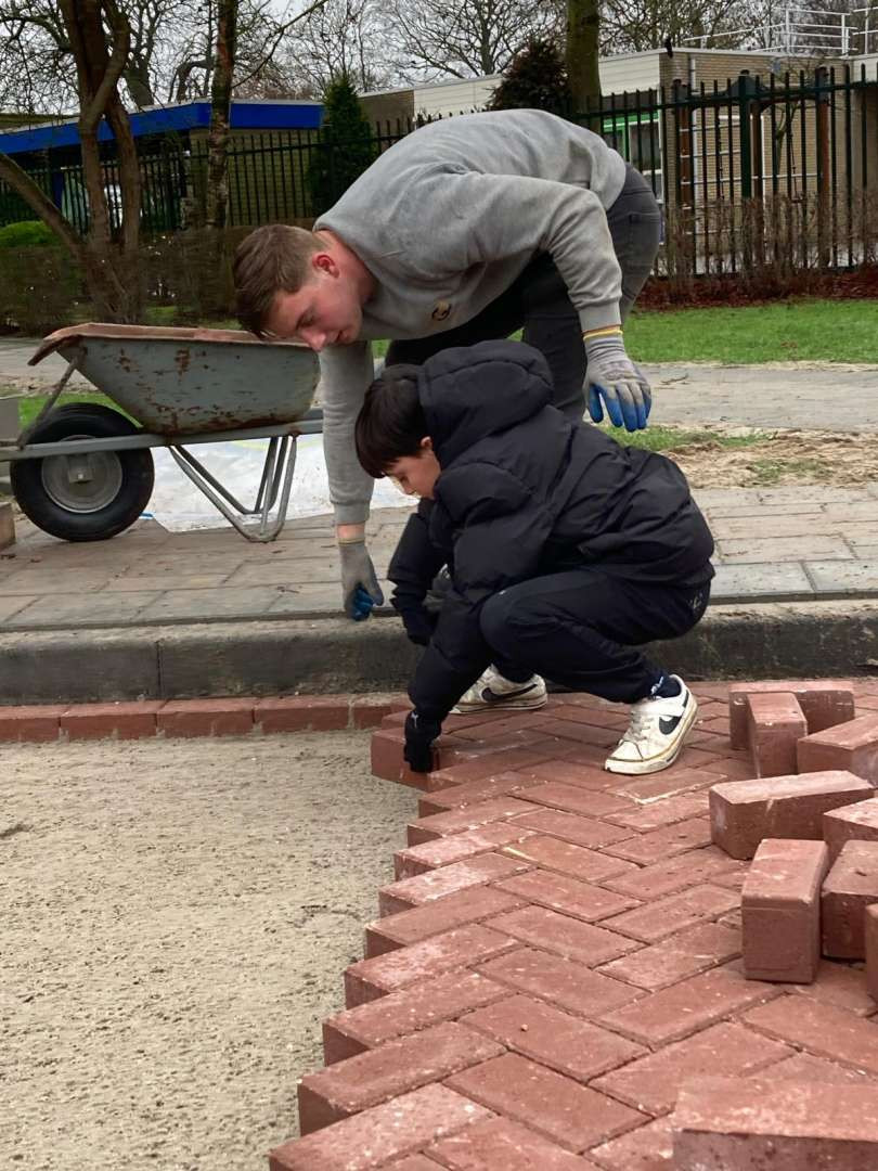 De timing kon niet beter, want precies naast de school zijn op dit moment werkzaamheden bezig. Yann mocht even naar buiten om het vak van heel dichtbij te bekijken en zelfs even uit te proberen onder toeziend oog van de vakmannen.